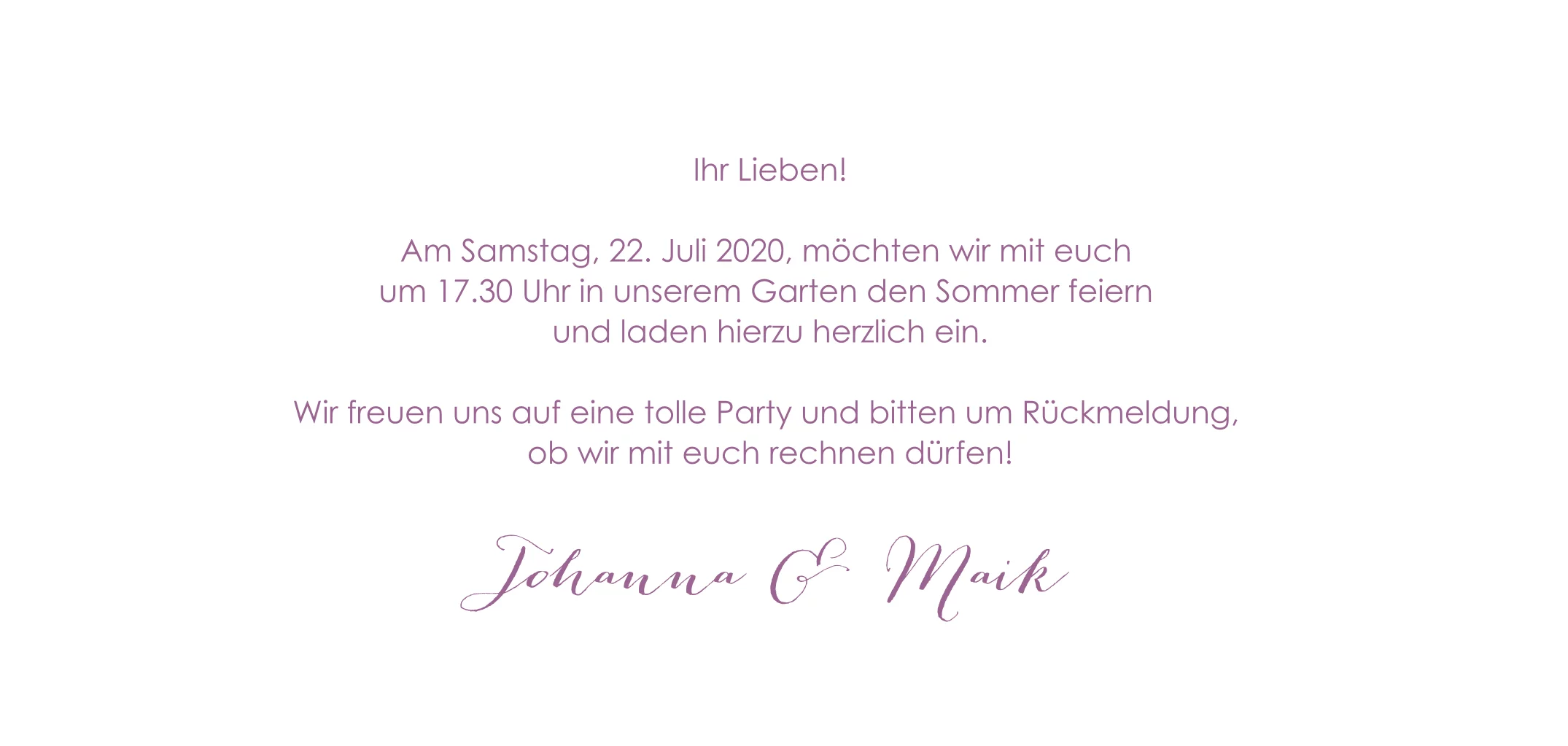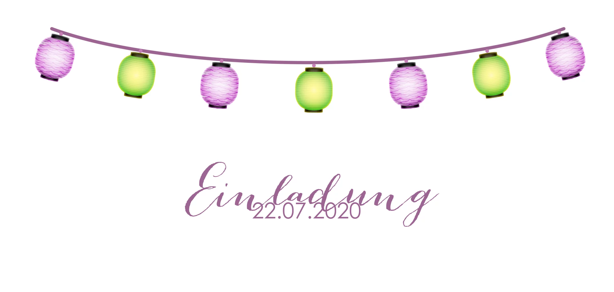 Klappkarte - Quer Eine Einladung zur Gartenparty in lila mit leuchtenden Lampions