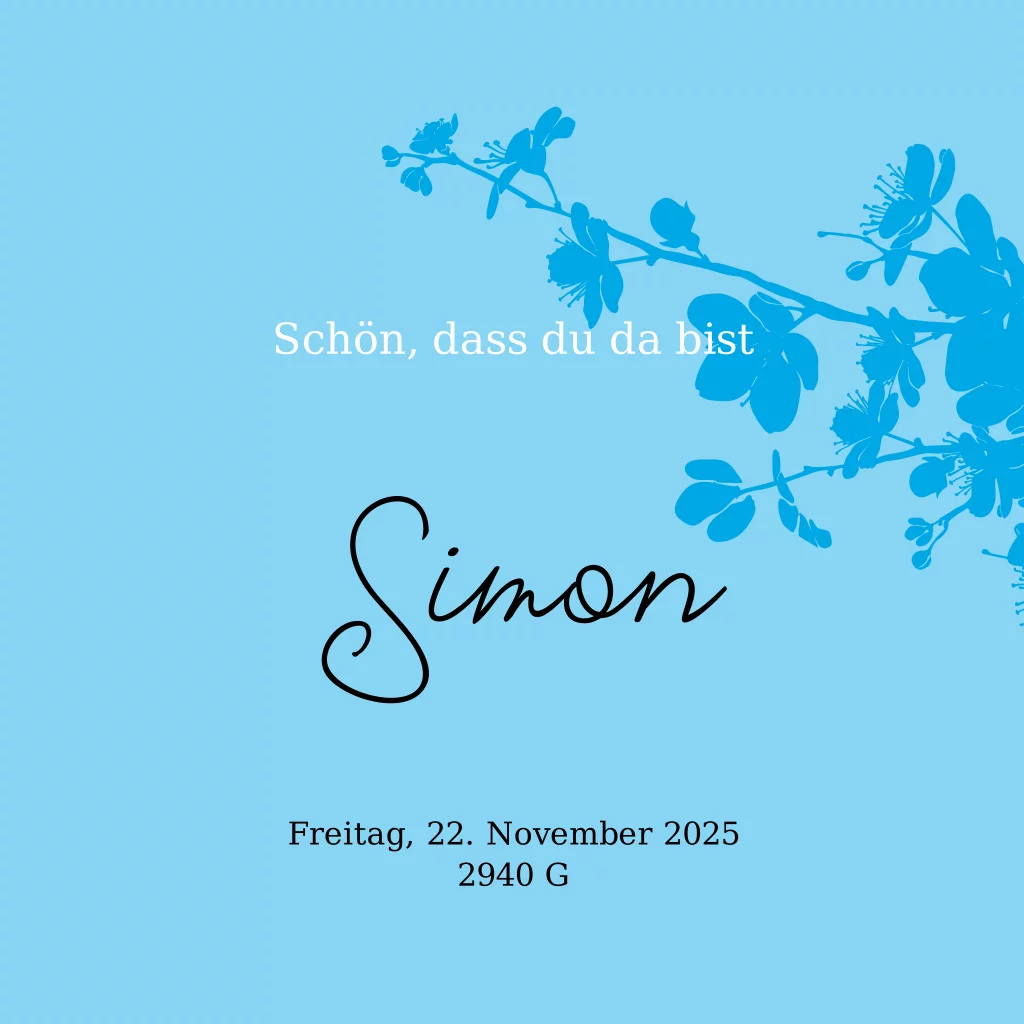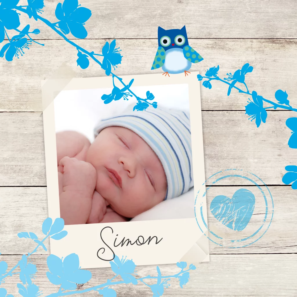 Geburtsanzeige für einen Jungen mit einer niedlichen Eule. Gestalten Sie die Karte mit einem Foto Ihres Neugeborenen. Die Farben können Sie selbst anpassen.