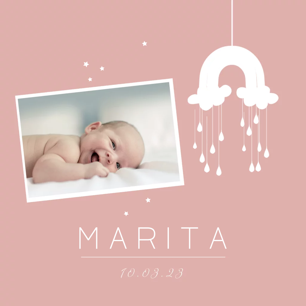 Süße Geburtskarte in rosa für Mädchen mit einem Regenbogen und Goldfolie. Setzen Sie ein Bild Ihrer Tochter ein und gestalten Sie eine individuelle Geburtskarte.