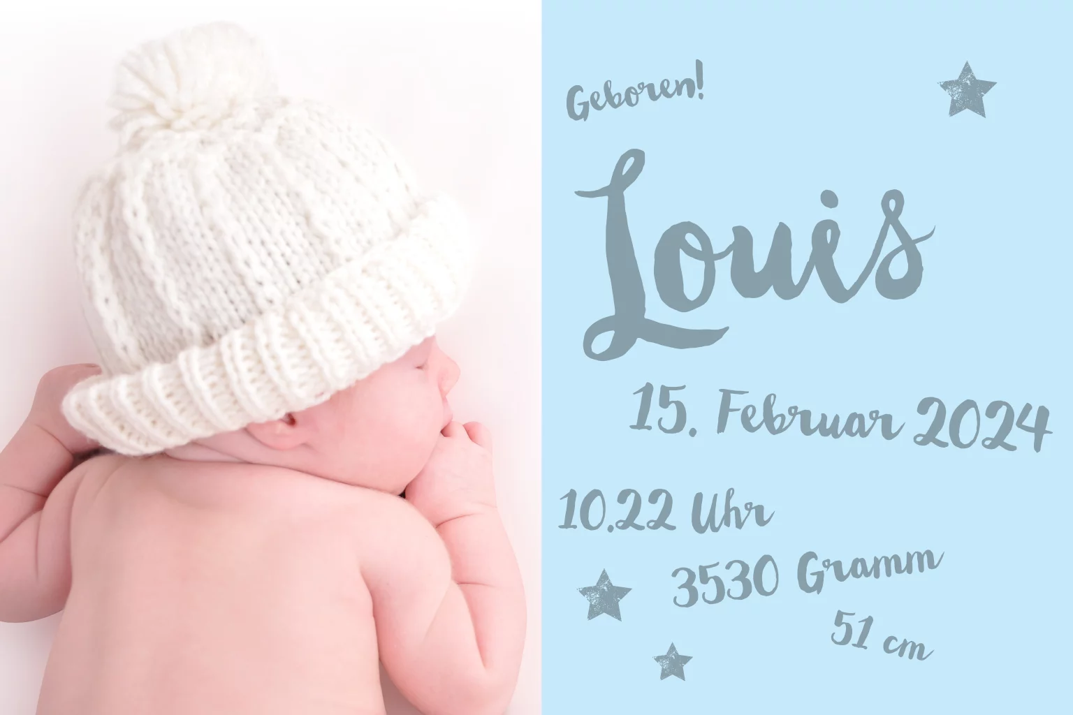 Geburtskarte mit einem Bild Ihres Kindes und Text für Zahlen und Daten der Geburt. Veröffentlichen Sie Ihr eigenes Foto und erstellen Sie eine einzigartige Karte.