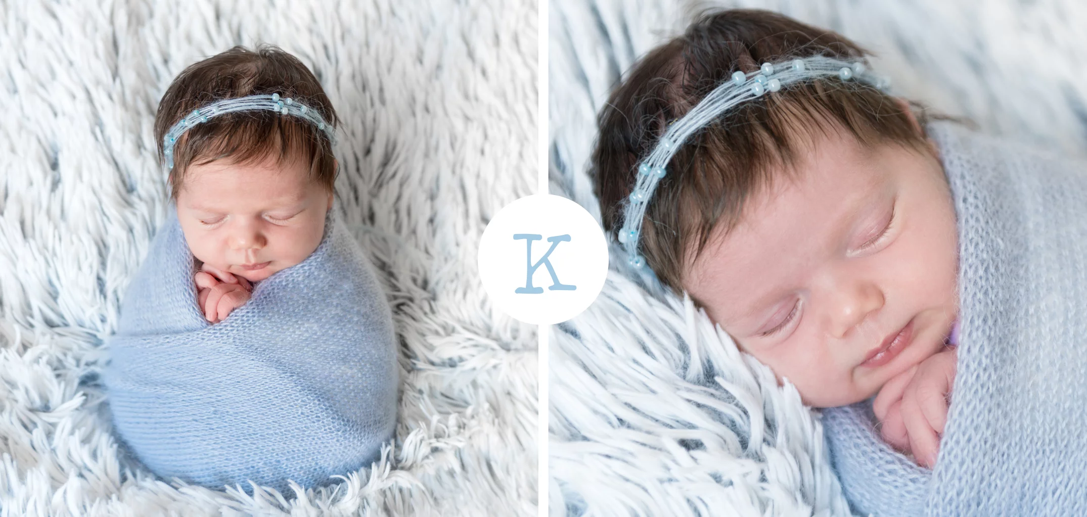 Stilvolle Geburtskarte mit zwei Fotos und Monogramm