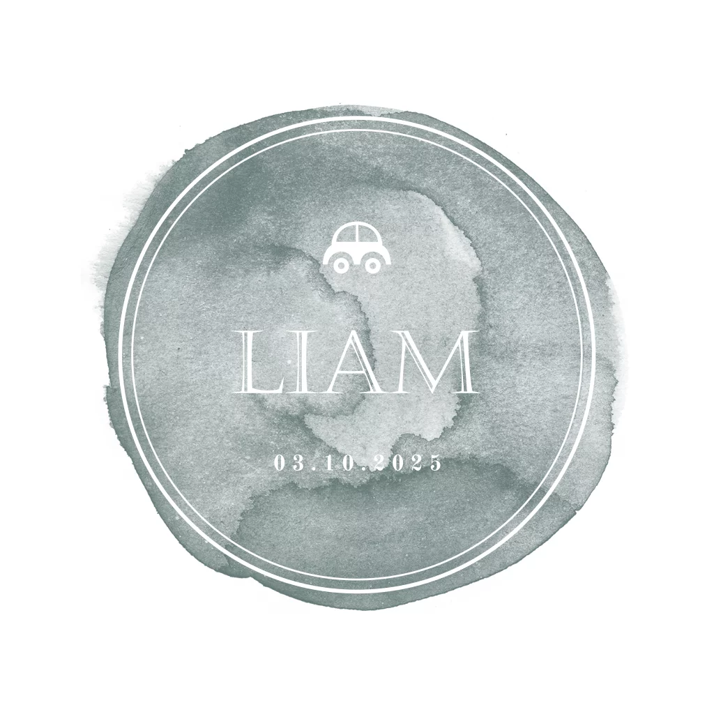Hübsche Geburtskarte mit einem Pastellkreis und einem kleinen Auto. Alle wichtigen Daten finden auf der Platz der Geburtskarte Ihres Nachwuchses.