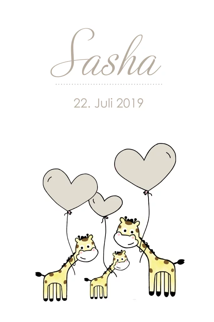 Süße Karte zur Geburt mit einer Giraffenfamilie und Herzenballons