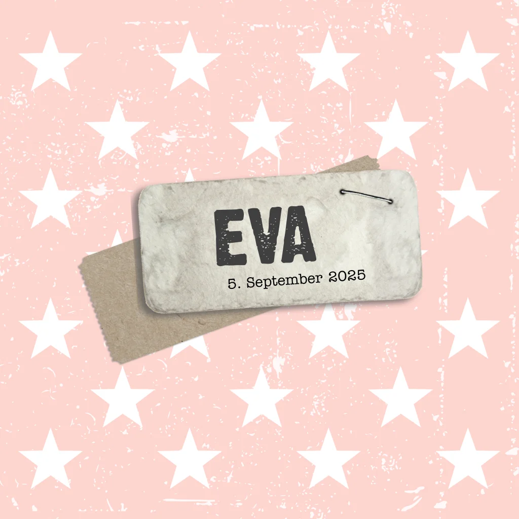 Klappkarte - Quadratisch braunes Namensschild auf rosa Hintergrund mit weißen Sternen