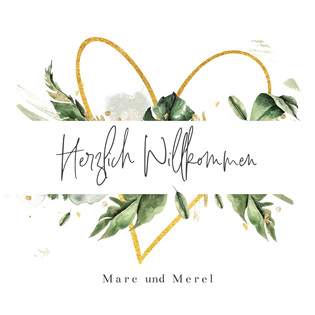 Willkommensschild mit goldenem Herzen und grünen Blättern - ø-60cm