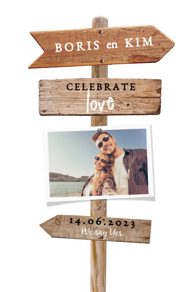 Hochzeitseinladung mit Holzschild als Wegweiser und Ihrem Foto