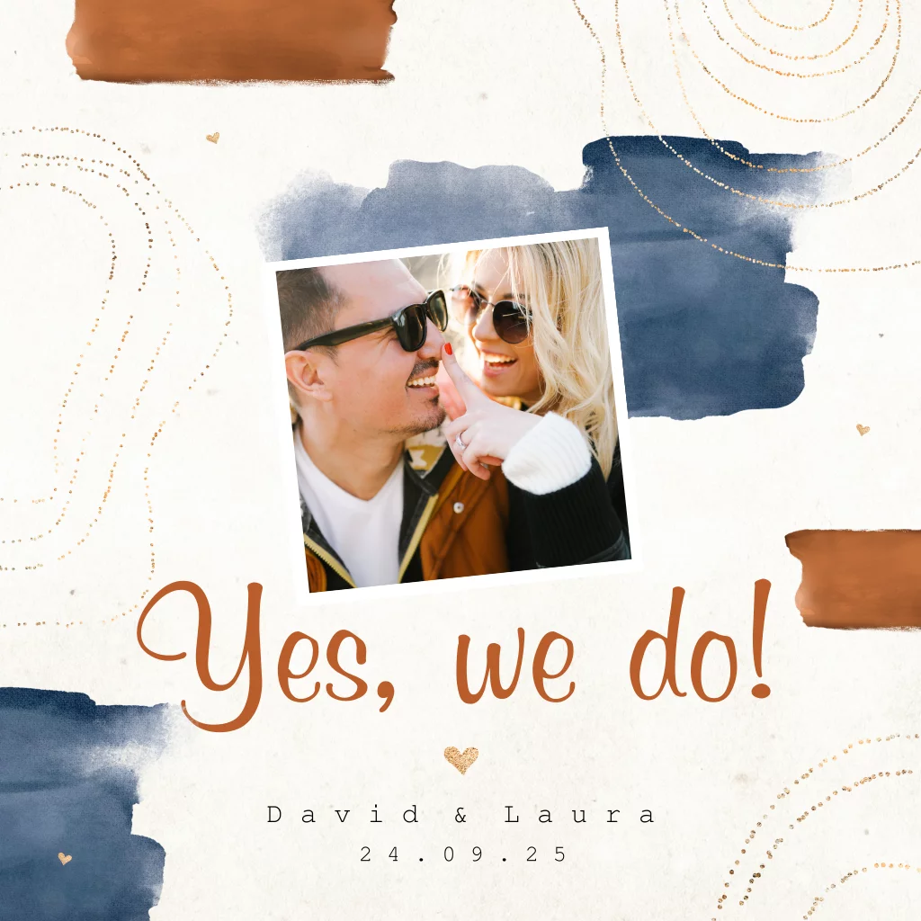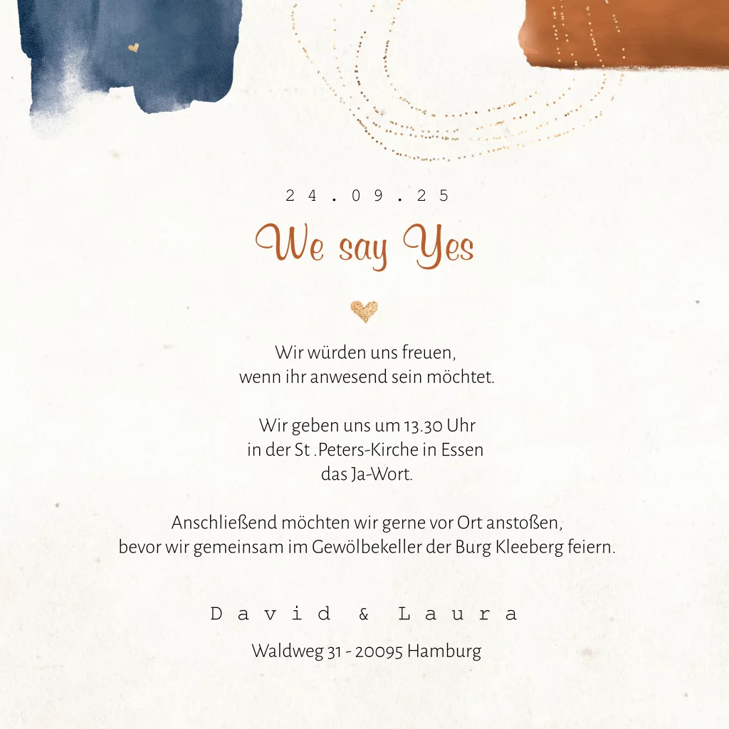 Hochzeitskarte mit Farbstrichen und dezenten goldenen Linien. Die Karte ist individuell anpassbar.