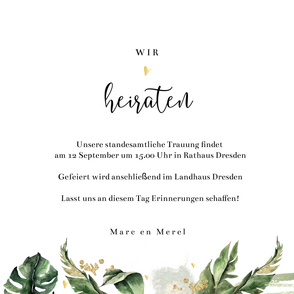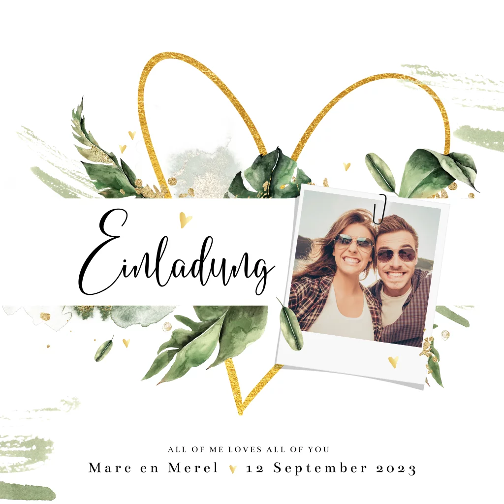 Hochzeitseinladung mit Foto, goldenem Herz und grünen Pflanzen.