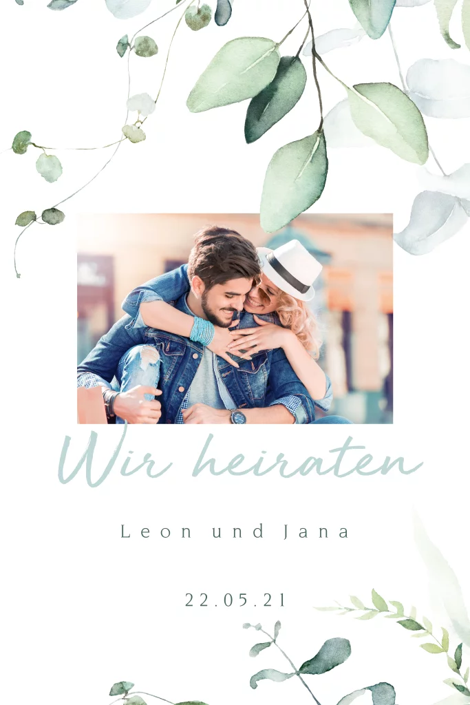 Hochzeitseinladung mit grünen Blättern und Ihrem Foto