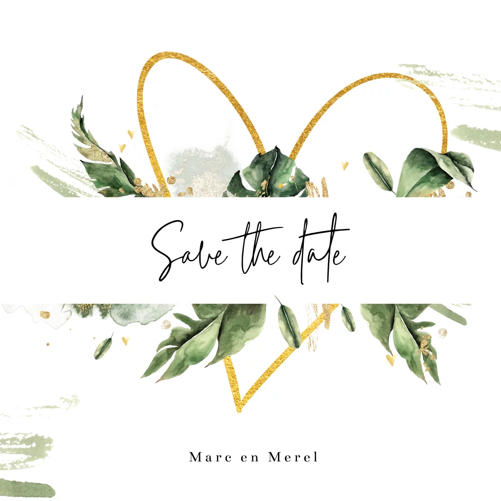 Save the Date Karte mit goldenem Herz und grünen Blättern