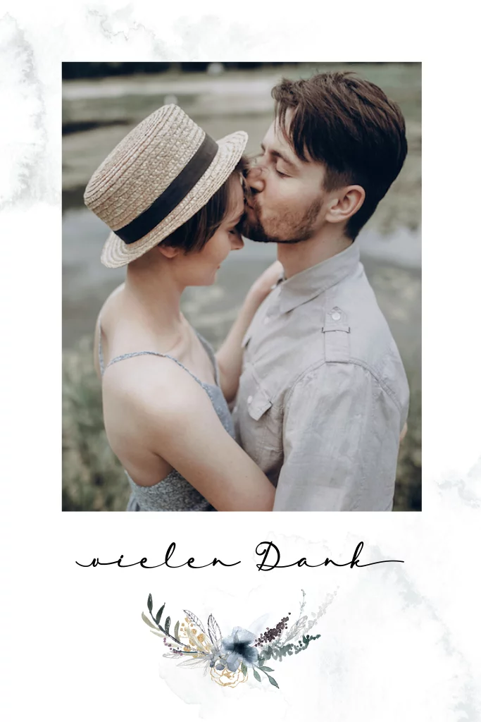 Dankeskarte mit Ihrem Foto der Hochzeit und Blumengesteck