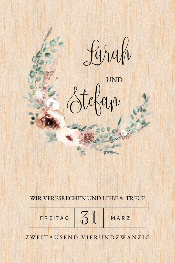 Hochzeitseinladung aus echtem Birkenholz mit Blumengesteck