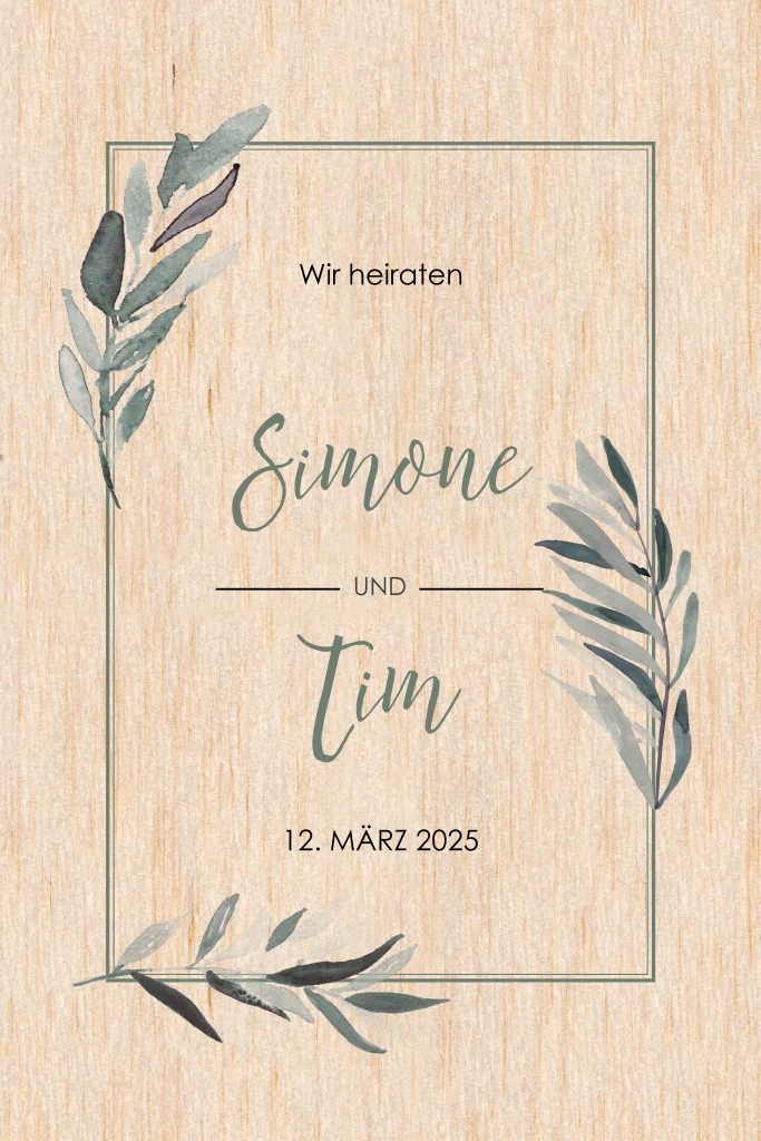 Hübsche Hochzeitseinladung auf echtem Holz mit Zweigen und Blättern