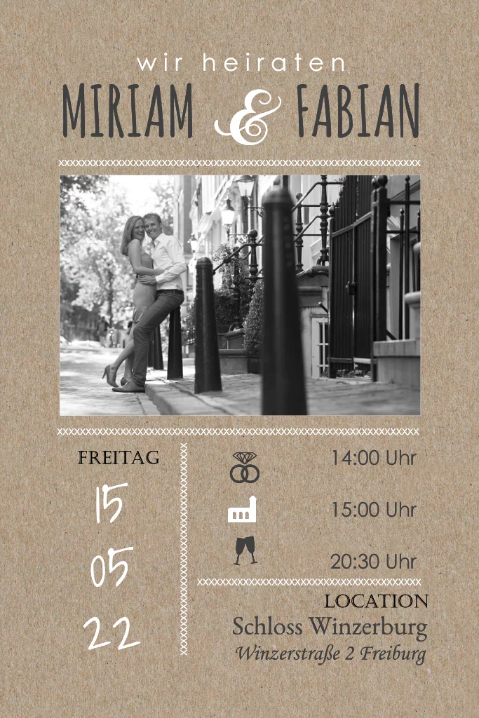 Hochzeitseinladung auf Kraftpapier mit Ihrem Foto und Programm