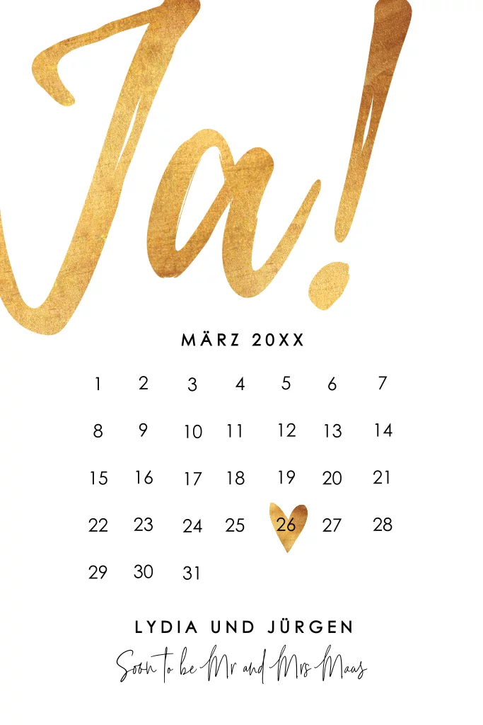 Hochzeitseinladung als Kalenderblatt mit einem goldenen "Ja": "JA"