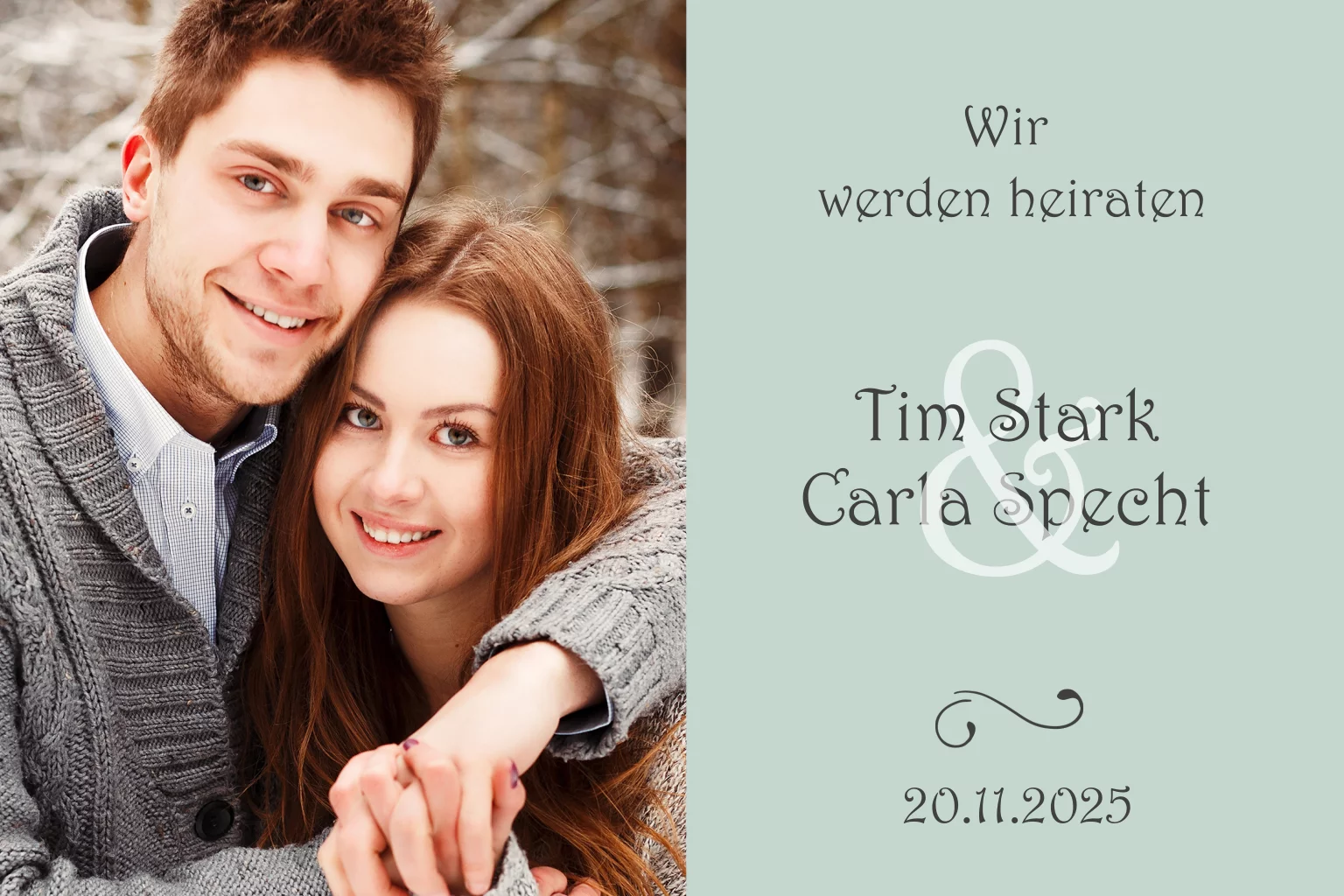 Stilvolle Hochzeitseinladung mit grünem Hintergrund und Foto