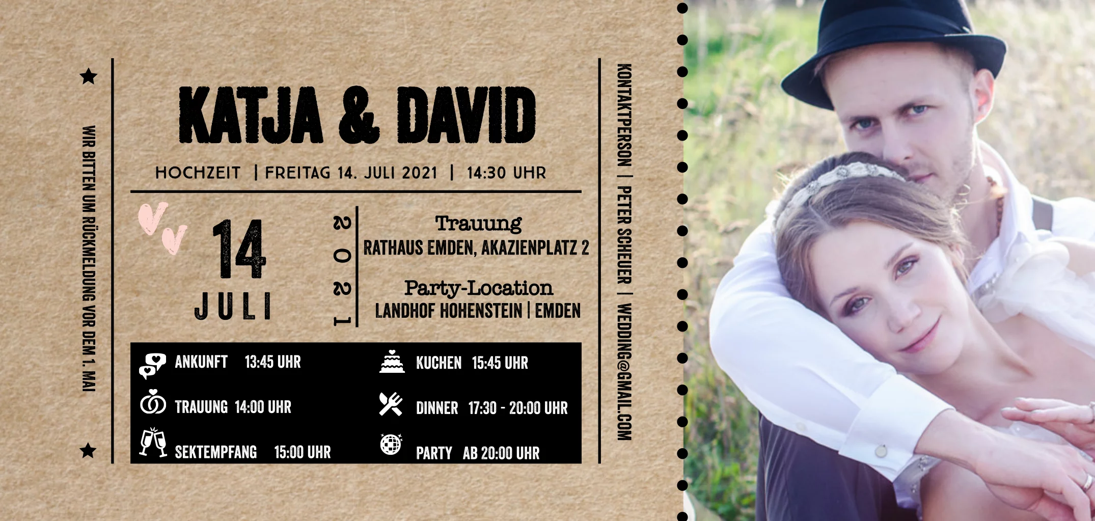 Hochzeitseinladung in Form eines Eintrittstickets zu Ihrer Hochzeit