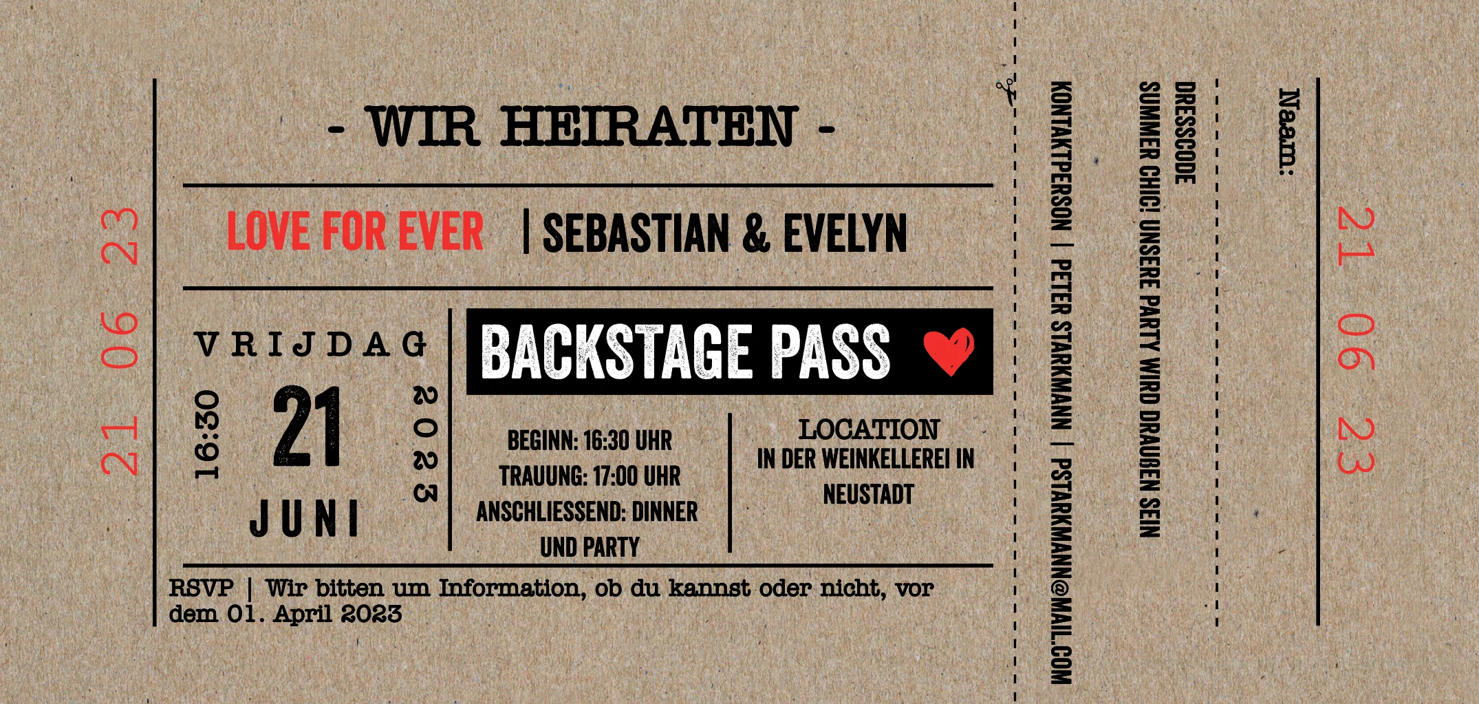 Ihre Hochzeitseinladung in Form eines Eintrittstickets auf Kraftpapier