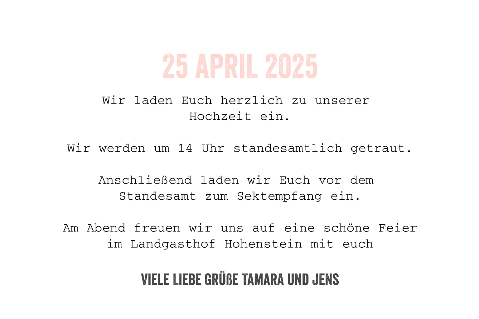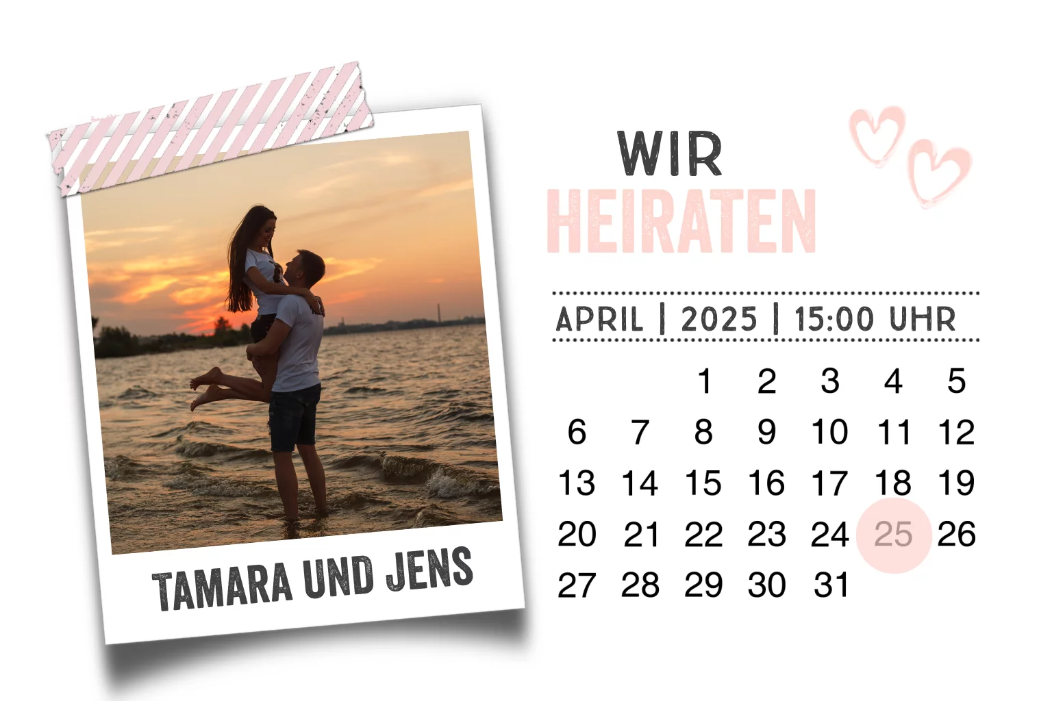 Romantische Hochzeitseinladung mit Polaroidfoto und Kalenderblatt