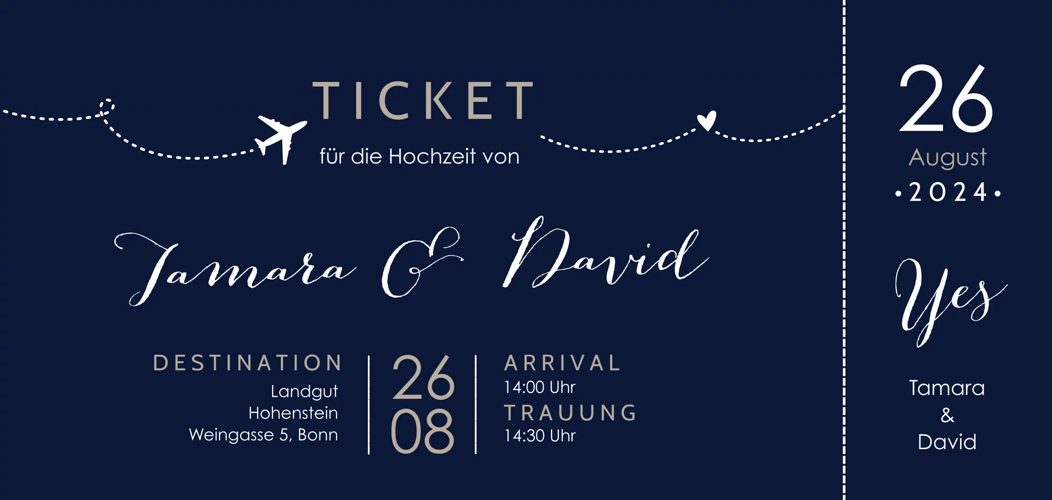 Kreative Hochzeitseinladung als Flugticket für das gemeinsame Leben