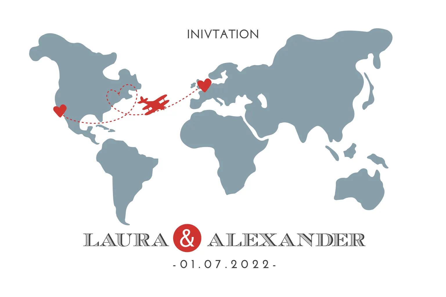 Hochzeitseinladung mit einer Weltkarte zum vereinen Ihrer Liebe