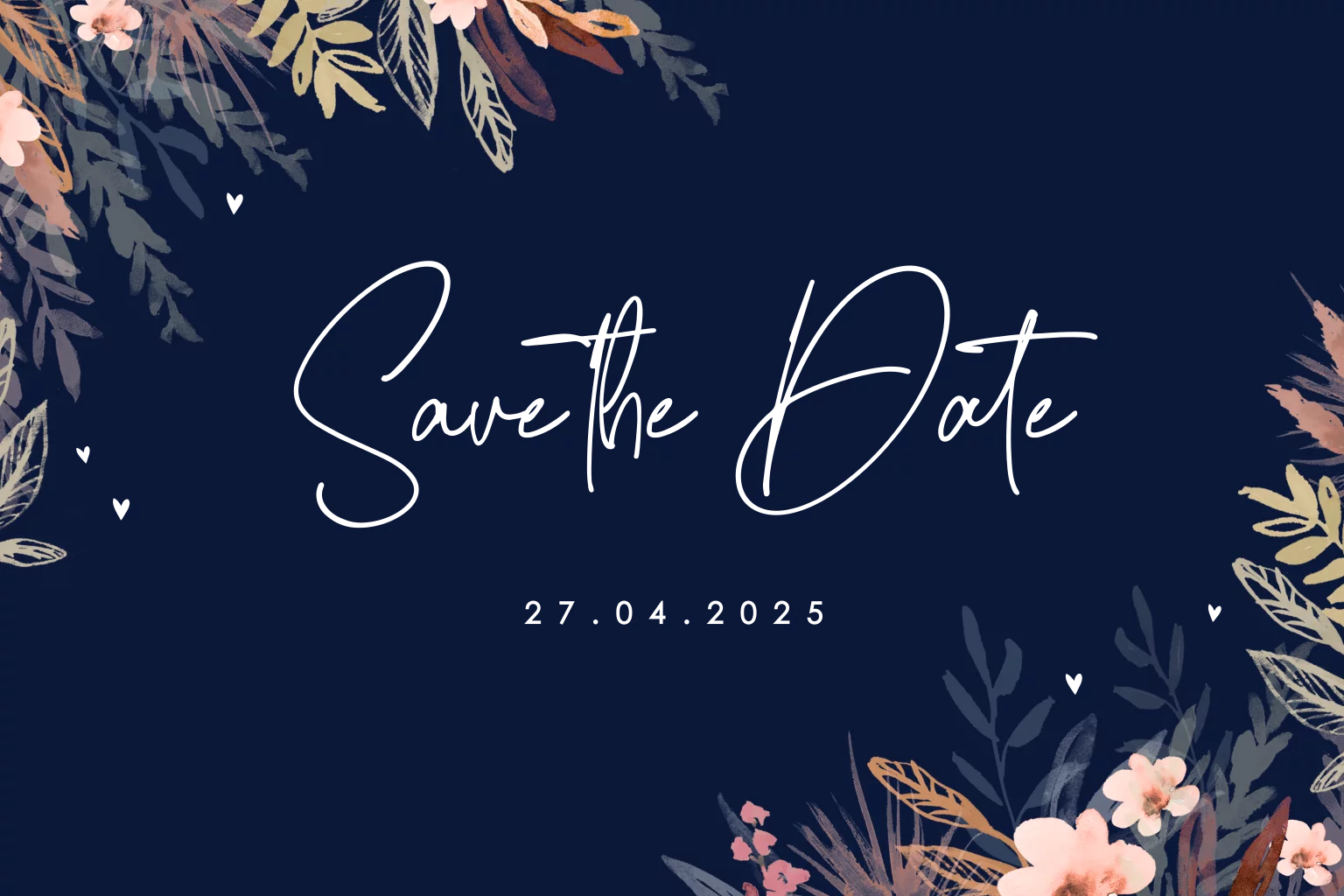 Save the Date Karte mit dunkelblauem Hintergrund und Pflanzenmotiv