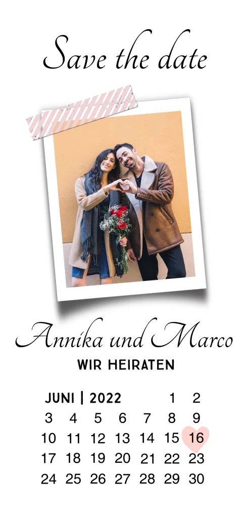 Save the Date Karte mit Ihrem Foto und Kalender für das Hochzeitsdatum