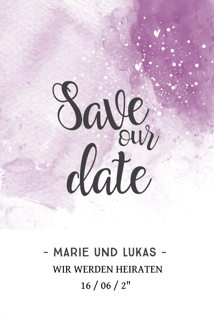 Verträumte Save the Date Karte mit violetten Pastellwolken