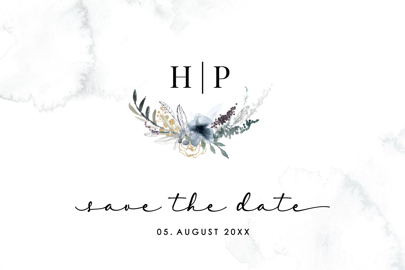 Save the Date Karte mit Blumengesteck und Initalen: "Blue Flower"
