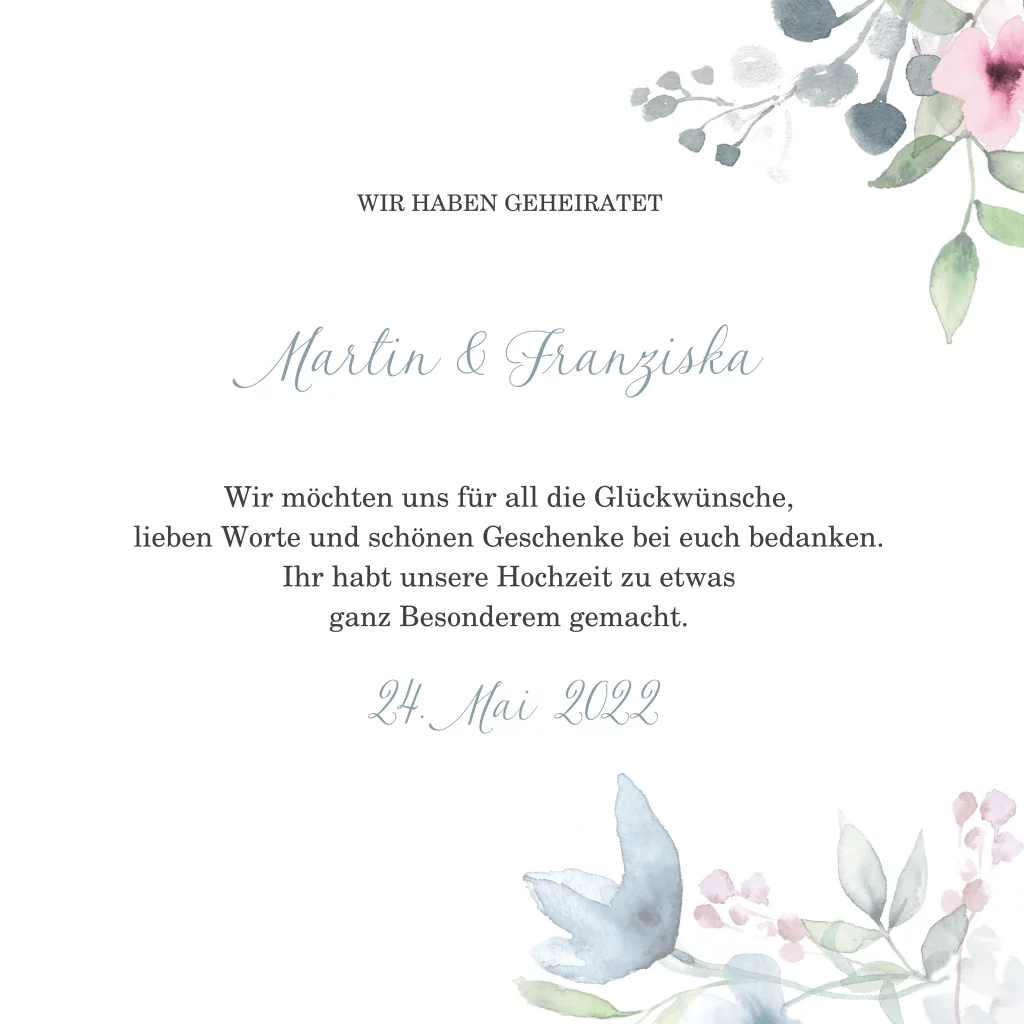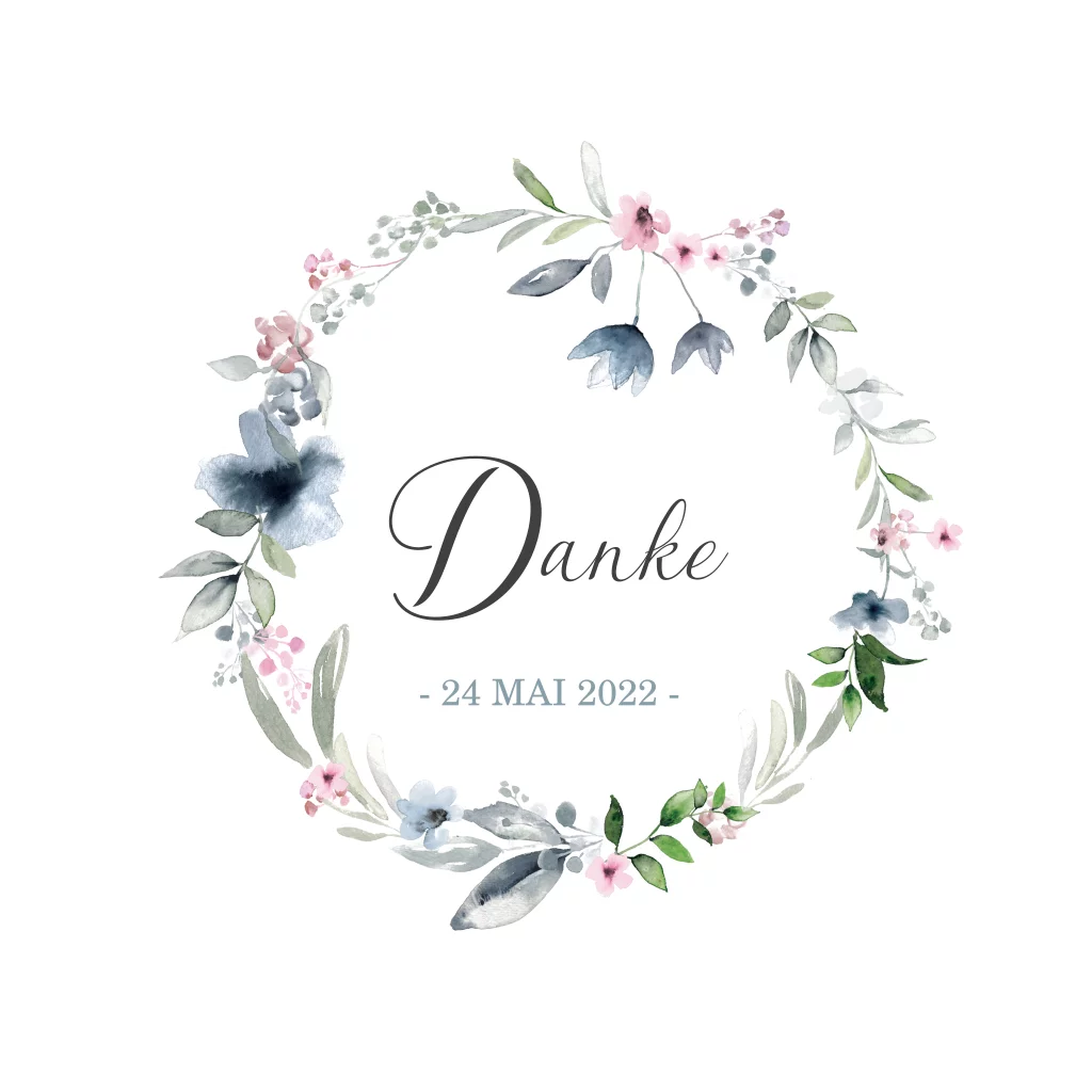 Dankeskarte mit Blumenkranz und Blüten in Blau und Rosa