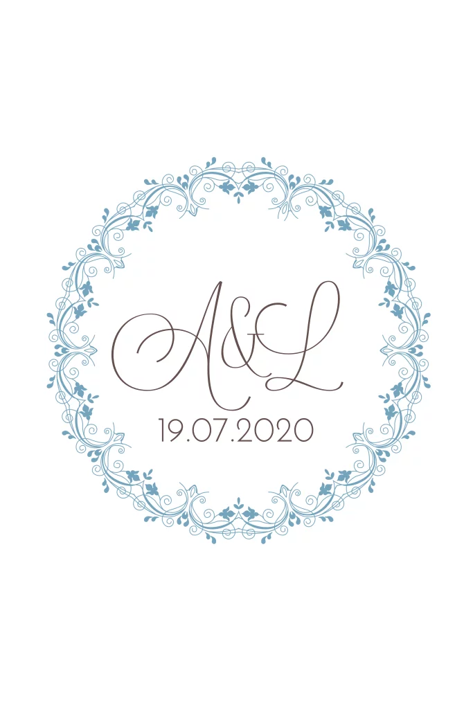 Hochzeitseinladung mit blauem Blumenkranz und Initalen: "Jewelful"