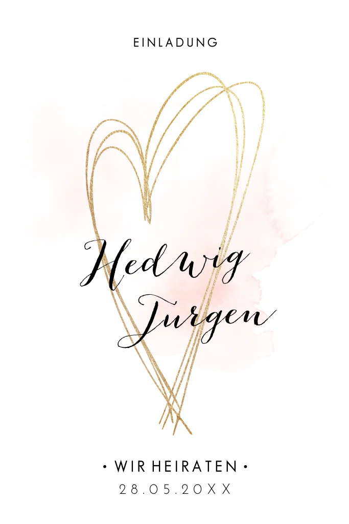 Ihre Liebe spiegelt sich in der Hochzeitseinladung "Goldherzen" durch drei ineinander verwobene Herzen mit einem Hauch rosa.