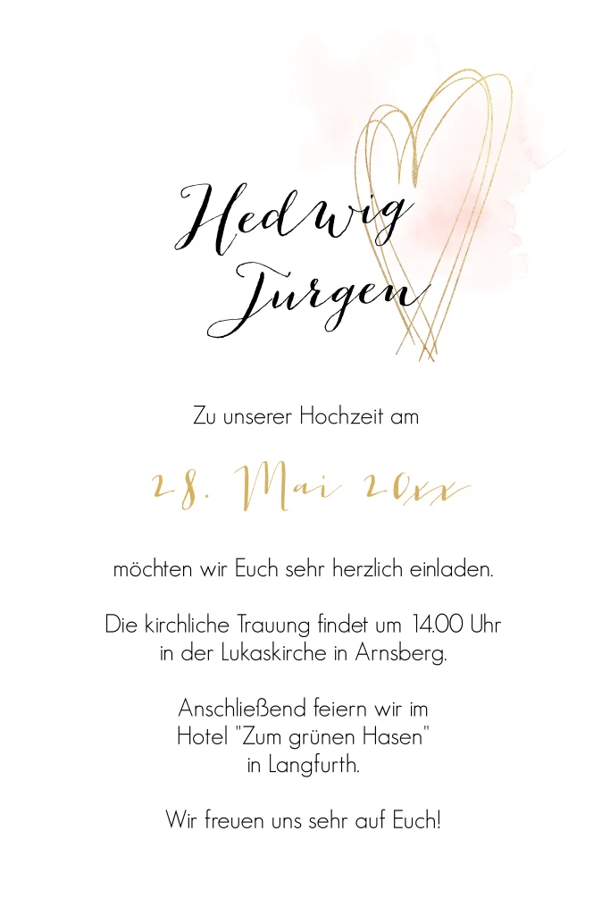 Hichzeitskarte mit goldenen Herzen & schwarze Schrift auf rosafarbenen Hintergrund.