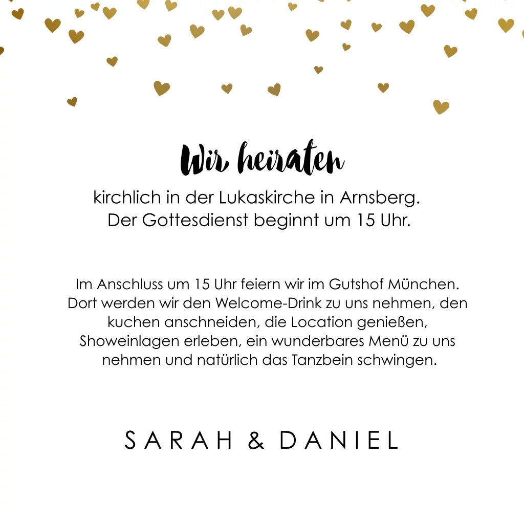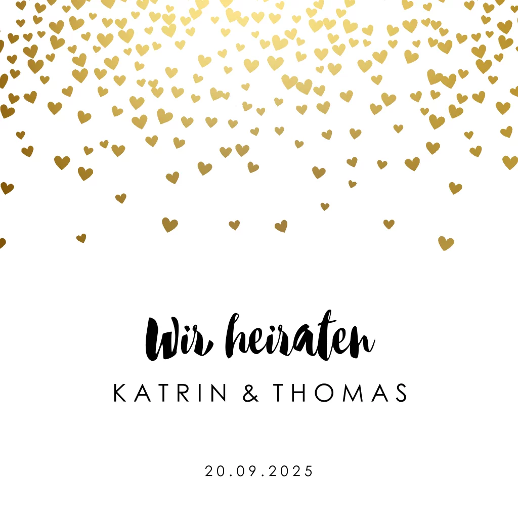 Die elegante Hochzeitskarte "Goldener Herzensschauer" bringt Ihre Liebe perfekt zum Ausdruck. Ihre Gäste werden große Vorfreude auf Ihre Hochzeit haben.