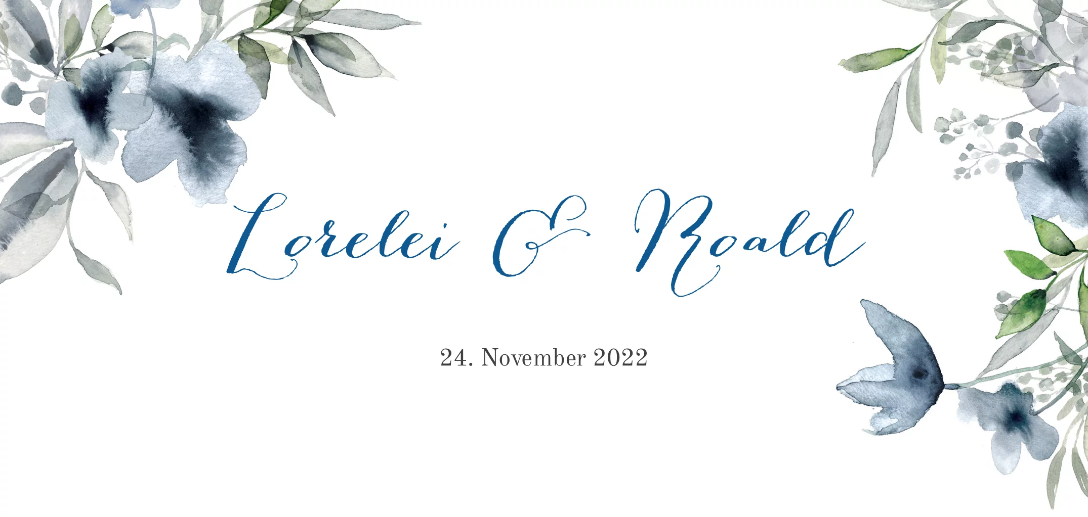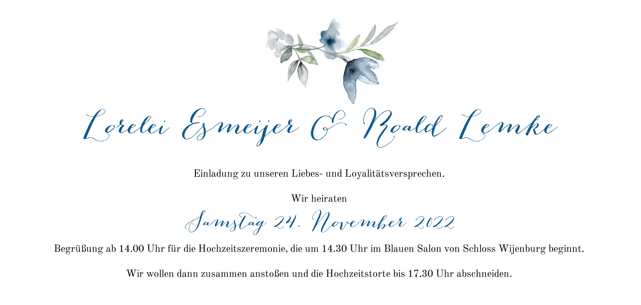 Hochzeitskarte mit blauen Blumen und Blüten.