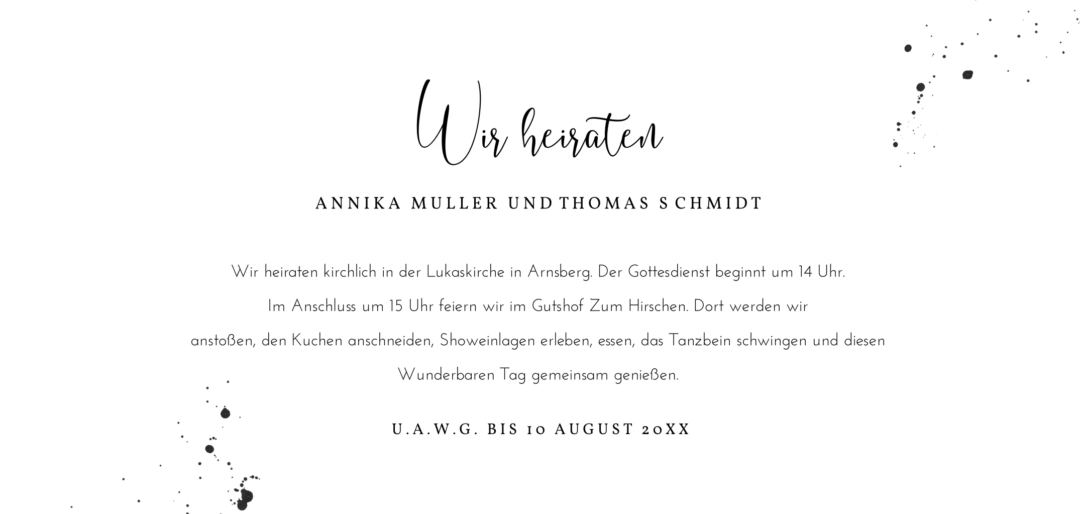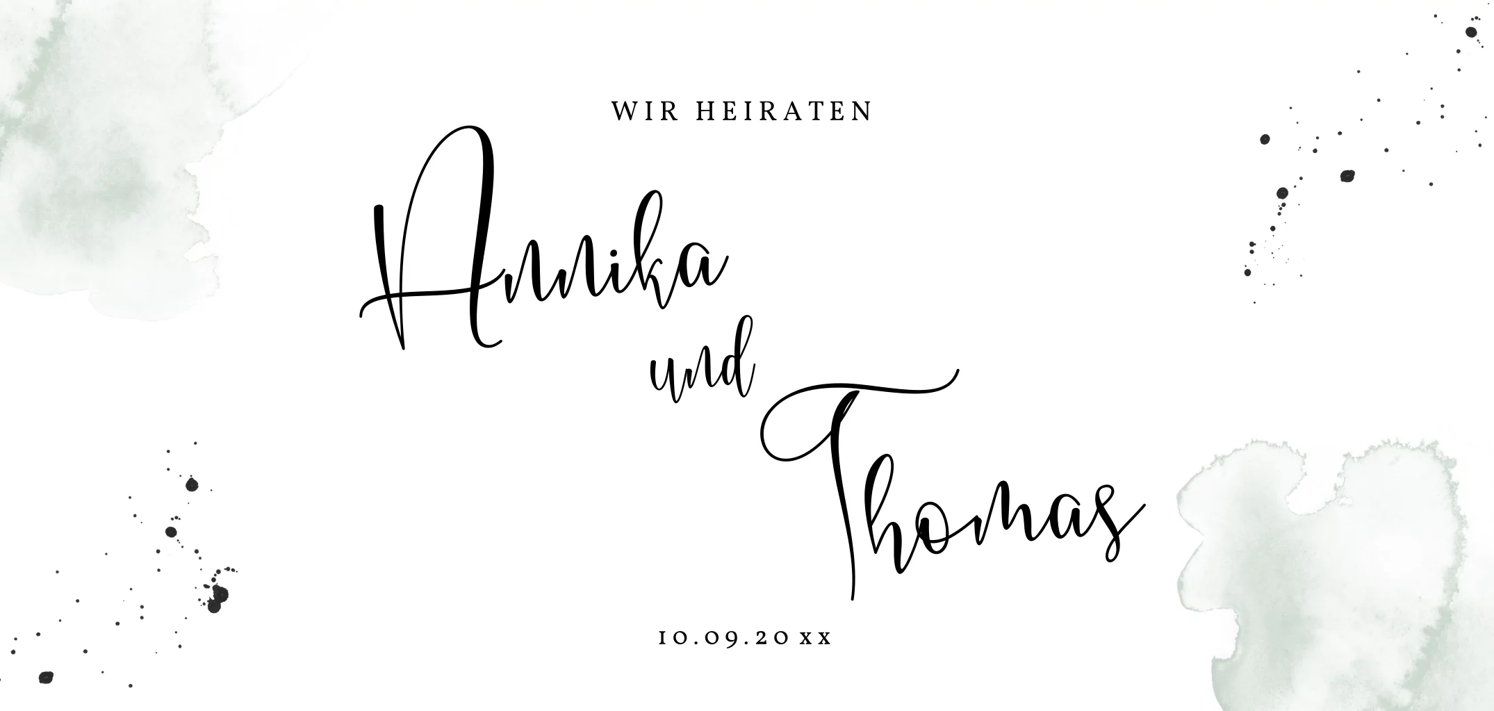 Die stilvolle Hochzeitseinladung "Pastellwolken" wird Ihre Gäste in Vorfreude auf Ihre Hochzeit versetzen. Klappkarte - Quer Hochzeitskarte mit Pastellwolken in grün und schwarzen Tintenklecksen.