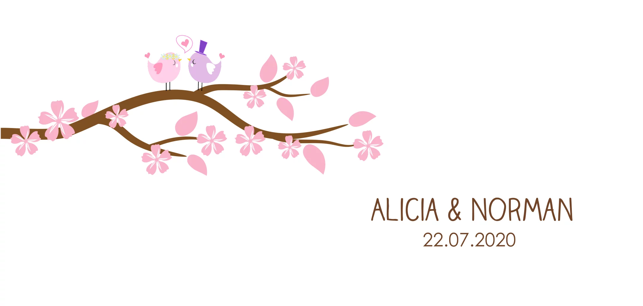 Hochzeitseinladung mit pinken Blüten und Vögeln auf einem Zweig
