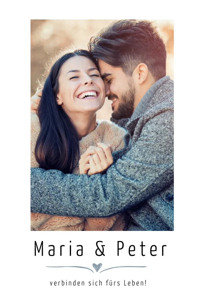 Hochzeitskarte mit individuellem Foto über schwarzer Schrift und grauem Herzen.
