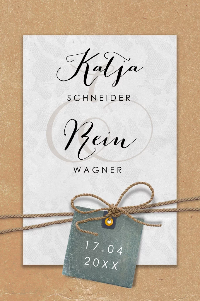 Hochzeitskarte mit schwarzer Schrift auf hellem Hintergrund, geschmückt mit einem gedruckten Anhänger.