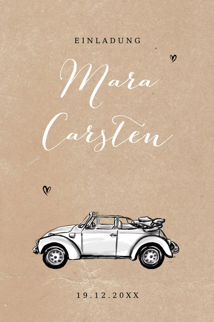 Hochzeitskarte mit einem Oldtimer auf einem braunen Hintergrund, der an einen Kraftkarton erinnert.
