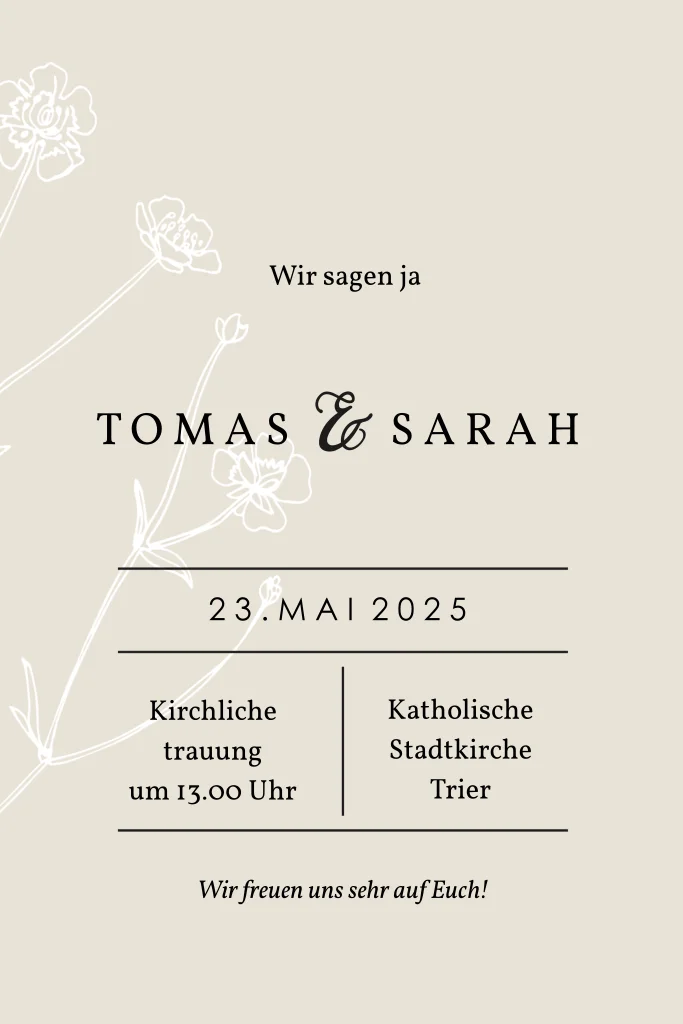 Elegante Hochzeitseinladung mit gezeichneten Blumen