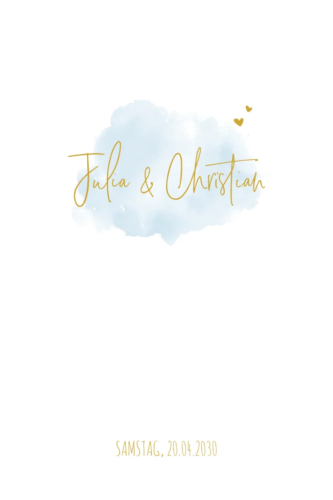 Hochzeitskarte mit einer blauen Pastellwolke und goldenen Herzen.
