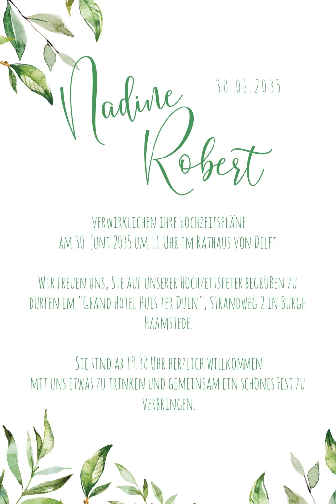Hochzeitseinladung für Ihre Hochzeit mit natürlicher Deko. Einfachkarte - Hoch. Hochzeitskarte mit grünen Aquarellblättern.
