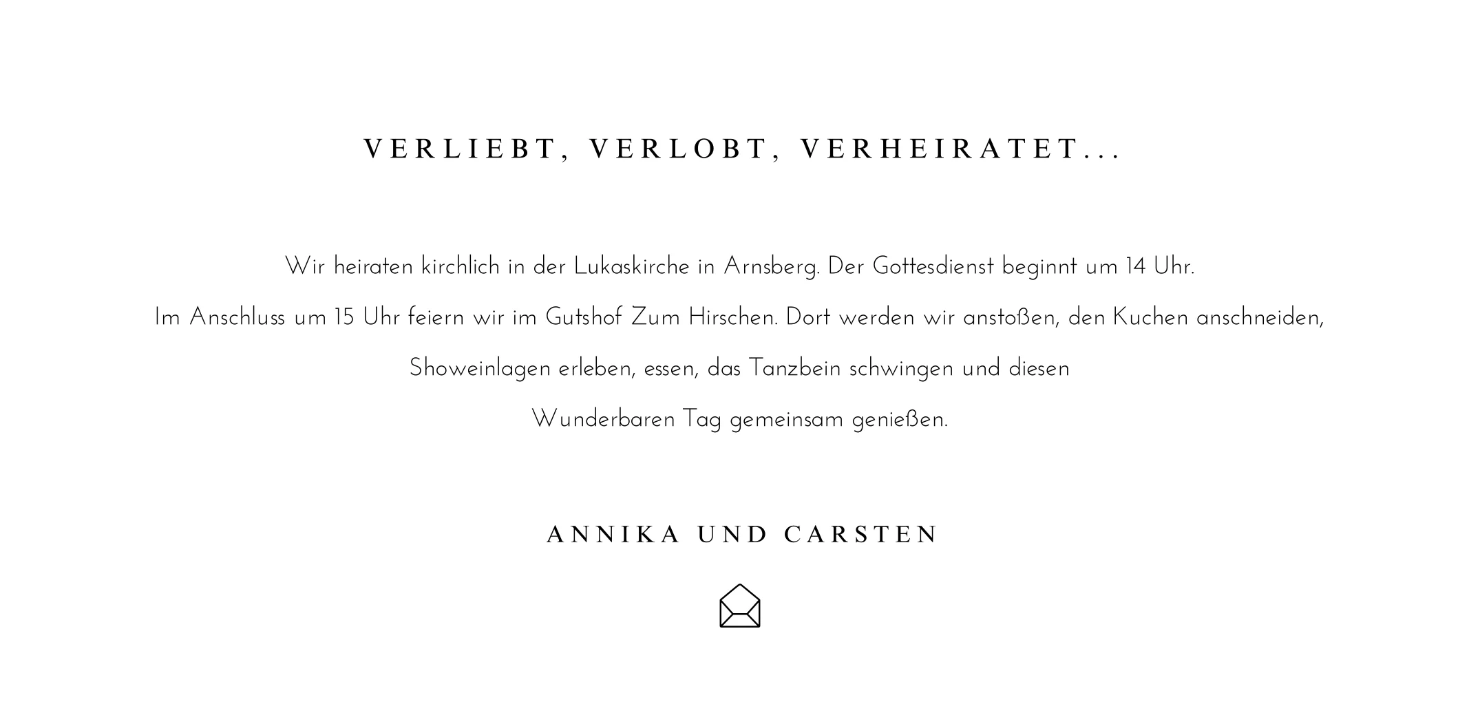 Küdniegn Sie Ihre Hochzeit groß an, mit der Hochzeuitskarte "Wir heiraten". Ihre Namen im Mittelpunkt, wie Sie selbst an Ihrer Hochzeit.