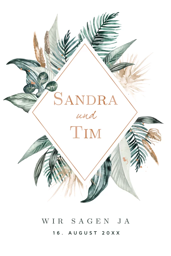Hochzeitseinladung mit einer Raute und Pflanzengesteck: "Jungle"