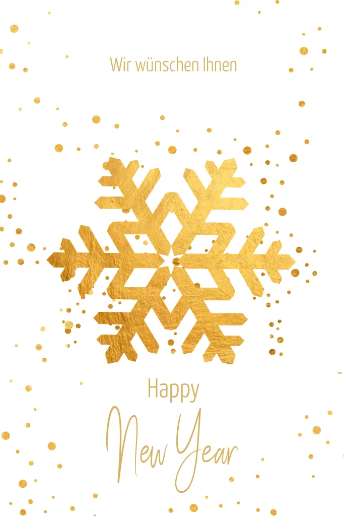 Weihnachtskarte auf weißem Hintergrund mit goldenen Punkten und einer großen goldenen Schneeflocke in der Mitte. Individualisieren Sie diese Weihnachtskarte im Editor der Paperlounge by Römerturm und passen Sie die Elemente nach Ihren Wünschen an.