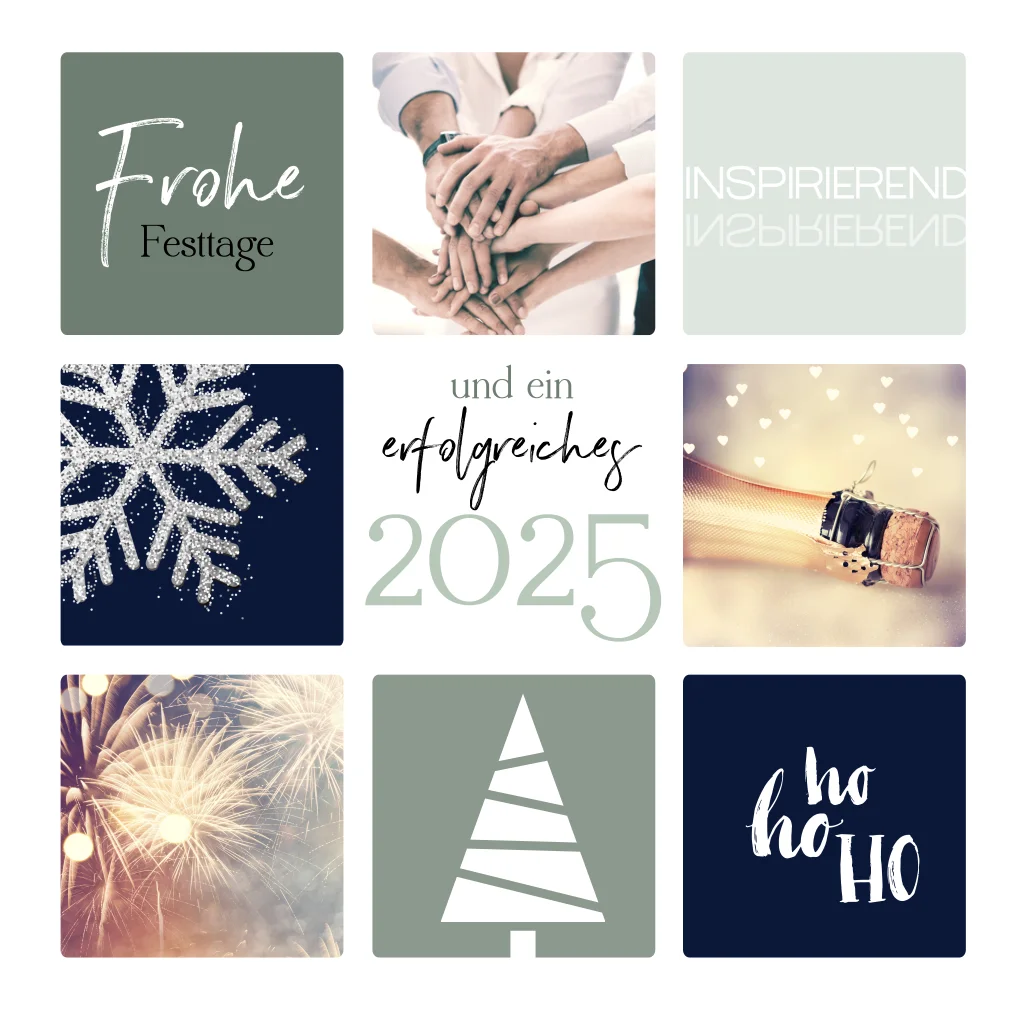 geschäftliche Weihnachtskarte mit verschiedenen Kacheln und Motiven darin. Setzen Sie Ihre eigenn Bilder ein und gestalten Sie Ihre ganz individuelle Weihnachtskarte für Ihre Geschäftspartner.