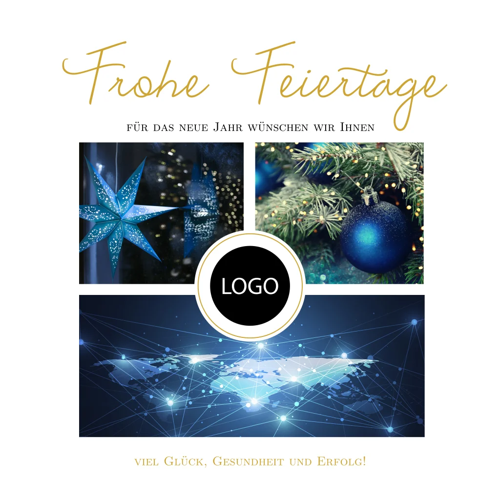geschäftliche Weihnachts- und Neujahrskarte mit ihren aussdrucksstarken Firmenfotos und Ihrem Logo in der Mitte des Covers.