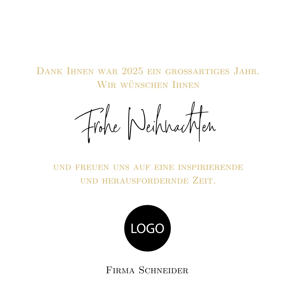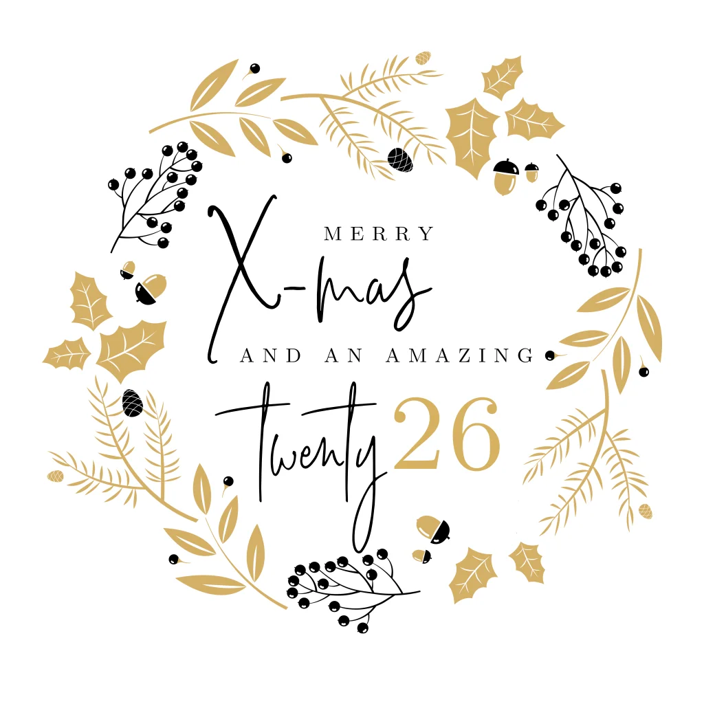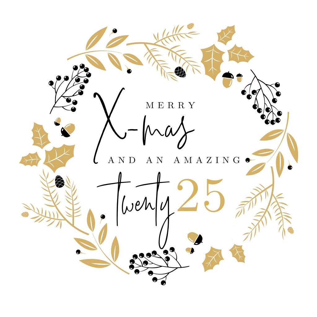 Fröhliche Weihnachtskarte mit einem goldenen Blätterkranz.