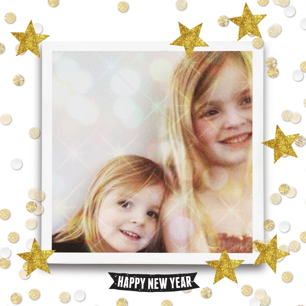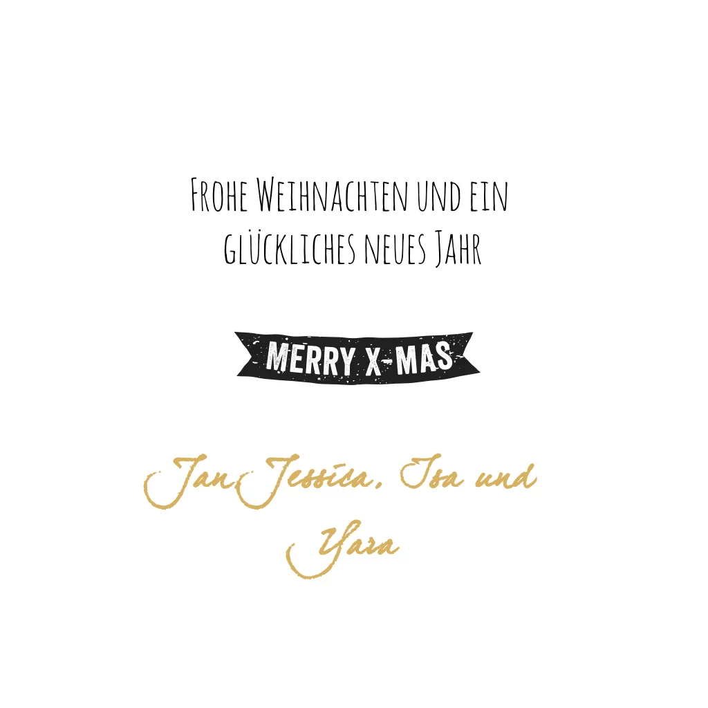 Weihnachtskarte mit eigenem Foto auf einem weißen Hintergrund mit goldenen Sternen und Konfetti. Platzieren Sie Ihr eigenes Foto auf der Karte und passen Sie die Karte individuell nach Ihren Wünschen an.